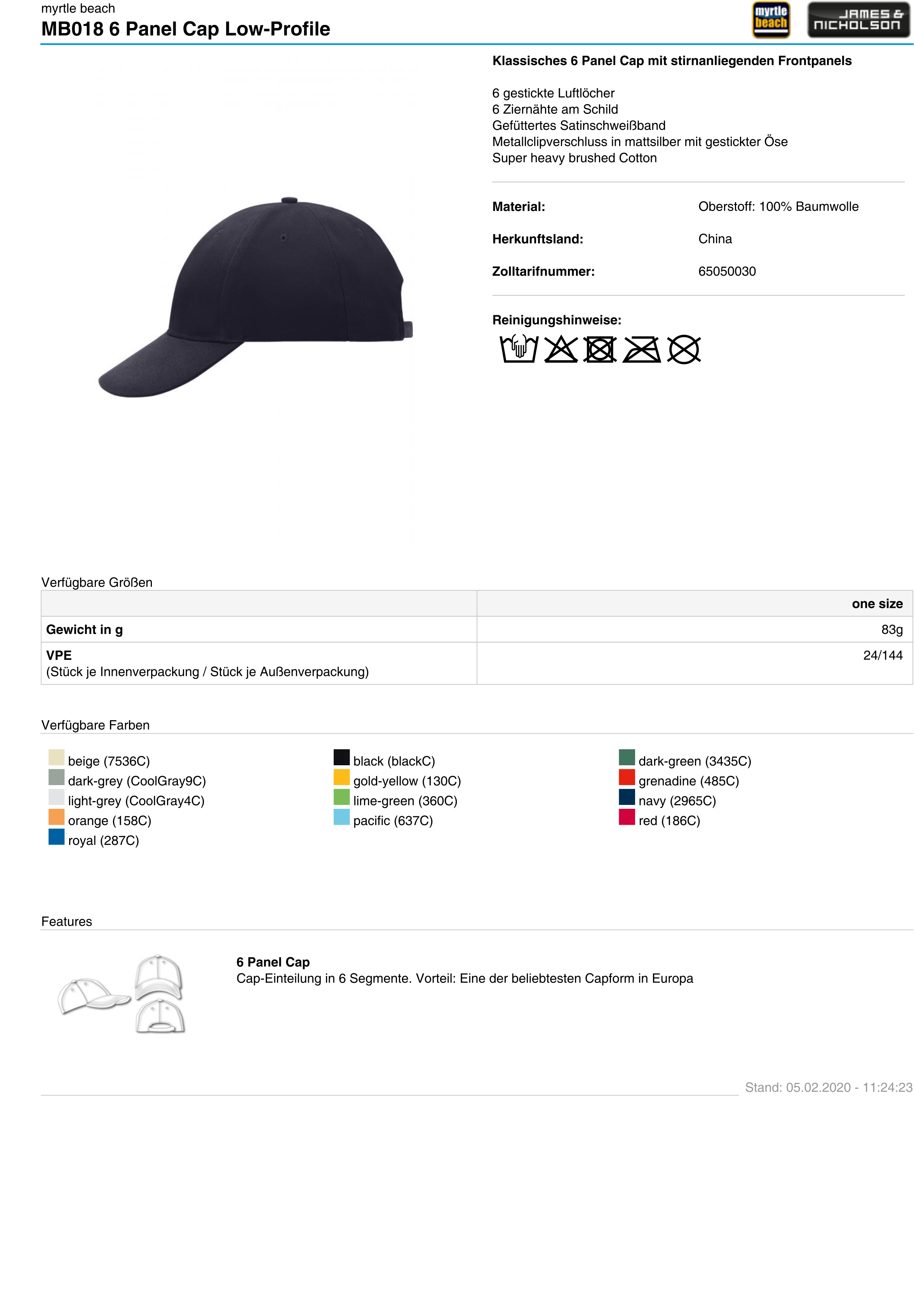 - Klassisches 6 Panel Cap mit stirnanliegenden Frontpanels