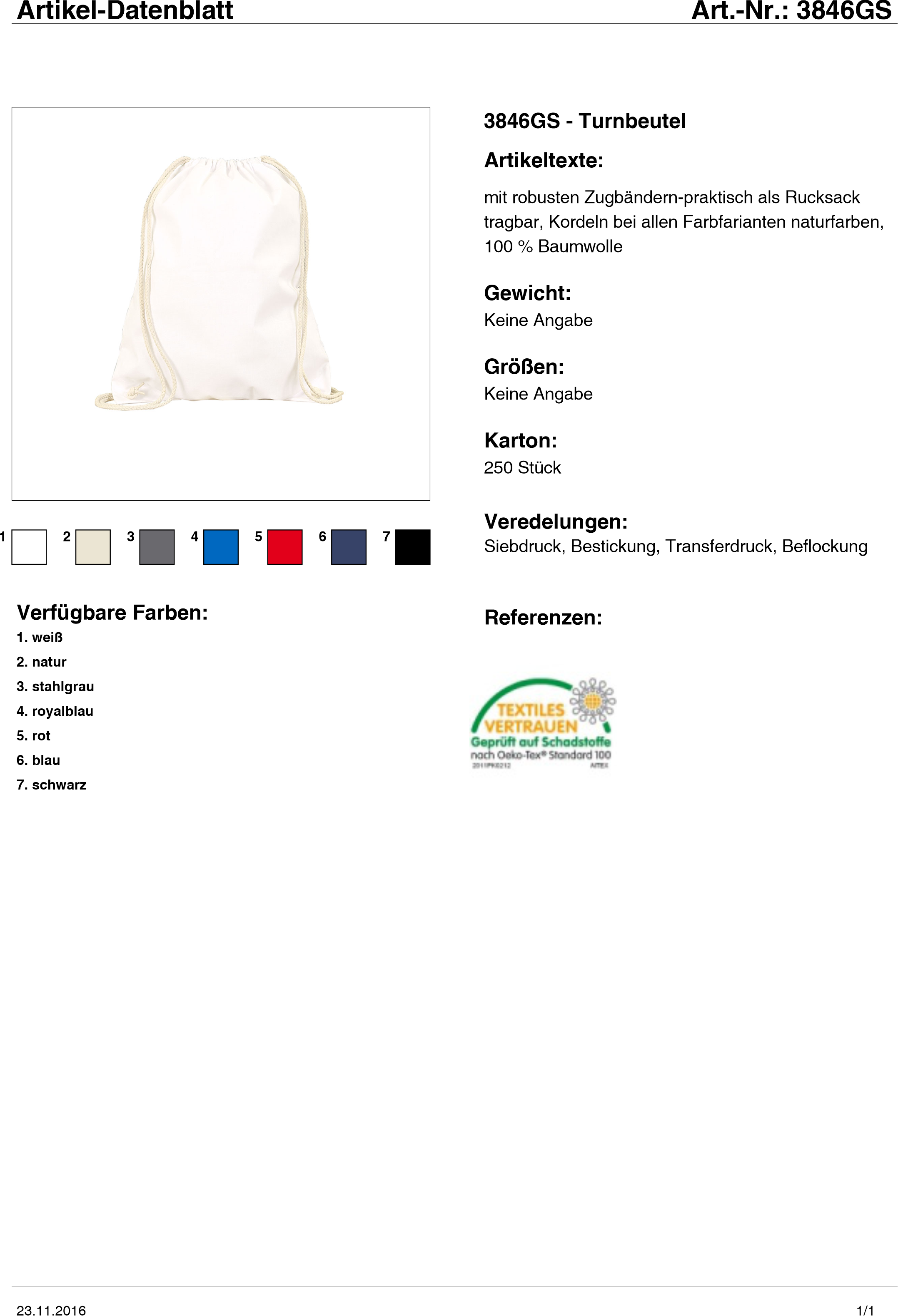 Turnbeutel mit robusten Zugbändern, Kordeln bei allen Farbvarianten Naturfarben.